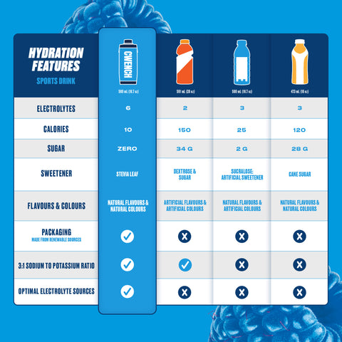 Nous n'utilisons pas de sucre car les boissons sucrées provoquent des pics de glycémie (et donc des chutes de sucre). En ayant un flux constant d’électrolytes, de vitamines et de minéraux entrant dans votre circulation sanguine – sans sucre – votre corps peut profiter des avantages d’ une hydratation constante et optimale.